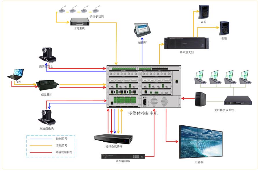 2、多媒体控制系统:采用XKTY星空科技生产的多媒体会议室核心设备----多媒体控制主机,集高清混合矩阵、数字音频处理器、集中控制主机、高清录播服务器于一体。
