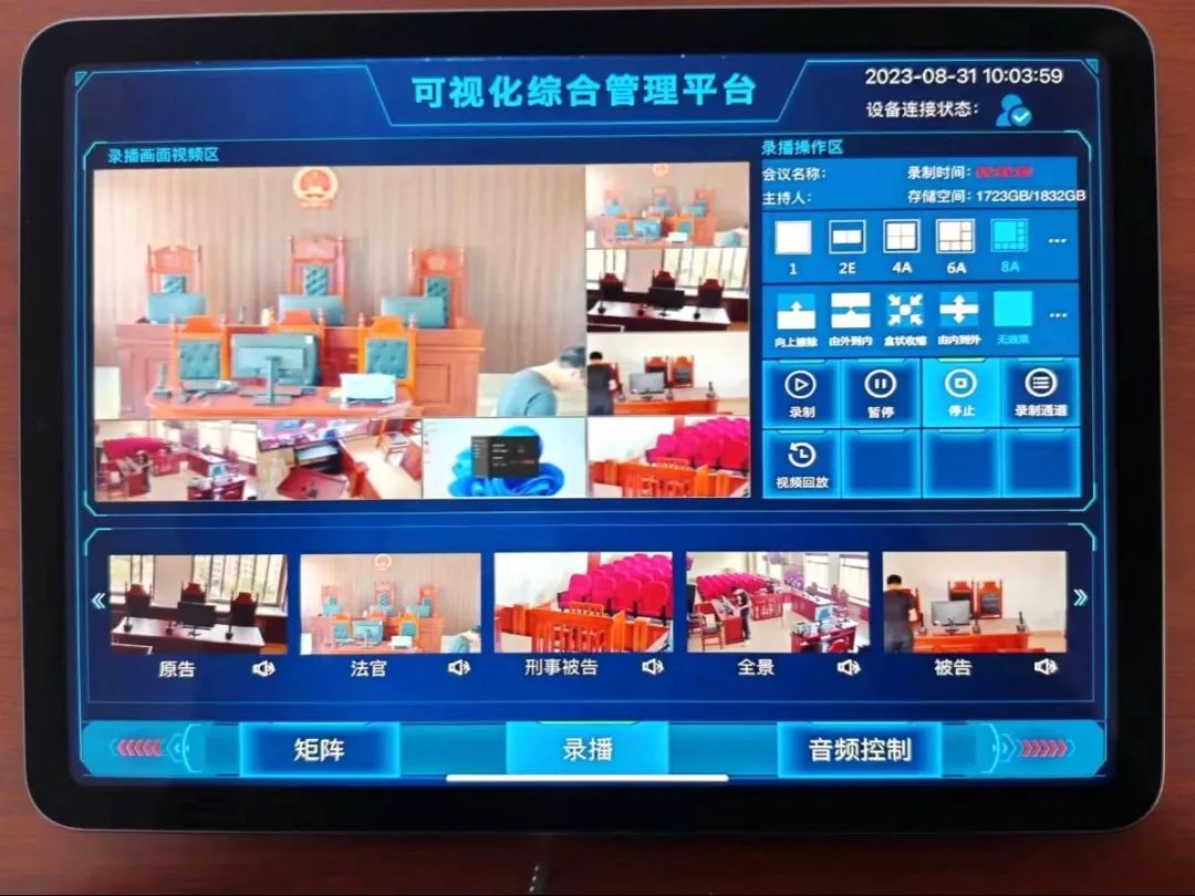 模拟法庭的核心硬件设备采用XKTY星空科技高清庭审主机,功能包含:庭审实况采集、示证采集、庭审音频处理、视频无缝切换、庭审集中控制、录播直播、远程提讯终端、多方远程庭审。产品采用ALL-IN-ONE的设计理念,运用热插拔模块化设计,软件可视化操作界面平台,具有安装简便,操作简单、维护容易等优点。